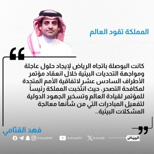 وفي هذا السياق، كانت البوصلة باتجاه الرياض لإيجاد حلول عاجلة ومواجهة التحديات البيئية خلال انعقاد مؤتمر الأطراف السادس عشر لاتفاقية الأمم المتحدة لمكافحة التصحر، حيث انتُخبت المملكة رئيساً للمؤتمر لقيادة العالم وتسخير الجهود الدولية لتفعيل المبادرات التي من شأنها معالجة المشكلات البيئية، خصوصاً أن تقريراً حديثاً للأمم المتحدة أشار إلى أن فقدان الغابات، وتدهور التربة، يقللان من القدرة على التكيف مع تغير المناخ وفقدان التنوع البيولوجي، مما يهدد المستقبل، ويجعل الأرض أقل إنتاجية للزراعة، ويؤثر سلباً على الأمن الغذائي.