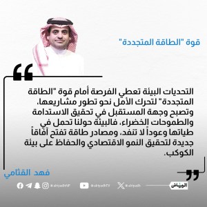 واليوم، المملكة مثال ونموذج في مشاريع الطاقة المتجددة، وخطاها حثيثة في ذلك، ولدينا يقين بأننا سنكون رواداً لذلك وتستفاد من خبراتنا في هذه المشاريع، خصوصاً أنها من أهداف الرؤية الطموحة التي غيرت كل شيء للأفضل وأصبحنا ننافس عالمياً في كل المجالات، ففي عام 2017م أطلقت مبادرة خادم الحرمين الشريفين للطاقة المتجددة وبدأت تنفيذ مشاريعها مُتبنيةً مفهوم الطاقة المتجددة وحلولها المبتكرة، كبدائل لطرق إنتاج الطاقة التقليدية بتكلفة منافسة وكفاءة عالية، وتستهدف الشركات الصناعية والمستثمرين والمطورين في القطاعين الحكومي والخاص، وتعمل على تحقيق ركائز أساسية تخدم المبادرة، منها: الاستفادة من التقنيات المتطورة المناسبة وتنفيذها، وتطوير وتوطين مجالات الطاقة المتجددة والقطاعات المتصلة بها، كما تعمل على أن تصبح المملكة رائدة عالمياً في هذا المجال، من خلال إنجازها النسبة المثلى من مصادر الطاقة البديلة لإنتاج الكهرباء، واستقطابها للاستثمارات، وتعزيز التنافسية عن طريق زيادة عدد الشركات المحلية والعالمية المنخرطة في المجال.