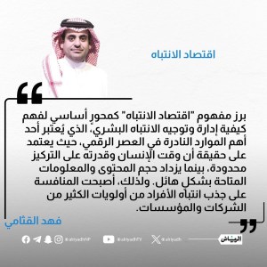 ولذلك، أصبحت المنافسة على جذب انتباه الأفراد من أولويات الكثير من الشركات والمؤسسات. واليوم، “اقتصاد الانتباه” هو نموذجٌ اقتصادي يركز على استغلال الانتباه البشري كسلعةٍ قيمة. بمعنى آخر، يمكن تشبيه الانتباه بالنفط في القرن الحادي والعشرين؛ فهو مورد محدود ويحتاج إلى استراتيجيات ذكية لاكتسابه. وتعمل الشركات التقنية ومنصات التواصل الاجتماعي على تصميم خدماتها بطريقةٍ تحفّز المستخدمين للبقاء أطول فترة ممكنة، ما يُترجم إلى أرباحٍ من خلال الإعلانات واستثمار البيانات، إذ تعتمد الشركات على مجموعةٍ من التقنيات لجذب الانتباه، أبرزها الخوارزميات الذكية التي تقوم بتخصيص المحتوى وفقاً لاهتمامات وسلوكيات المستخدمين، والإشعارات الفورية التي تُستخدم لإعادة توجيه انتباه الأفراد إلى التطبيقات والمنصات، إضافةً إلى التصميم النفسي الذي يستغل علم النفس لجذب الانتباه وزيادة التفاعل. وعلى الرغم من أن “اقتصاد الانتباه” أسهم في تحسين الوصول إلى المعلومات والتفاعل الاجتماعي، ومكّن مستخدمي التقنية من الوصول إلى مصادر تعليمية وترفيهية، وحسّن التواصل العالمي، إلا أن له تأثيرات سلبية، مثل الإرهاق الذهني نتيجة الاستهلاك المستمر للمحتوى، والتشتت الرقمي، حيث يصعب على الأفراد التركيز على مهمةٍ واحدة بسبب التدفق المستمر للإشعارات، والتأثير الاجتماعي، إذ أدى التنافس لجذب الانتباه إلى تصميم محتوى مثيرٍ للجدل. كما أن التأثير يمتد إلى الصحة النفسية للأفراد، حيث أظهرت الدراسات أن الاستخدام المفرط للتكنولوجيا الرقمية يمكن أن يؤدي إلى مشكلات مثل القلق والاكتئاب. وهذا ما يتطلب ضرورة تعزيز الوعي الرقمي ومساعدة مستخدمي التقنية على إدارة وقتهم وانتباههم بفعالية، ووضع حدودٍ للتأثير السلبي للتقنية، بالإضافة إلى أهمية حثّ الأفراد على تطوير مهاراتهم في إدارة الوقت والتركيز، والاستفادة من التكنولوجيا بشكلٍ متوازن، والحصول على الفائدة دون التأثير السلبي على الصحة النفسية والجسدية، وفي خضم هذه البيانات التي نتعرض لها يومياً، فإن “اقتصاد الانتباه” ليس فقط مفهوماً اقتصادياً بل واقعاً نعيشه بمختلف السياقات. وفهم هذا الاقتصاد وآثاره يمكن أن يساعد الأفراد والمجتمعات على تحقيق توازنٍ بين الاستفادة من التكنولوجيا والحفاظ على مواردهم النفسية والعقلية، مع ضمان استدامة هذا المورد في المستقبل.