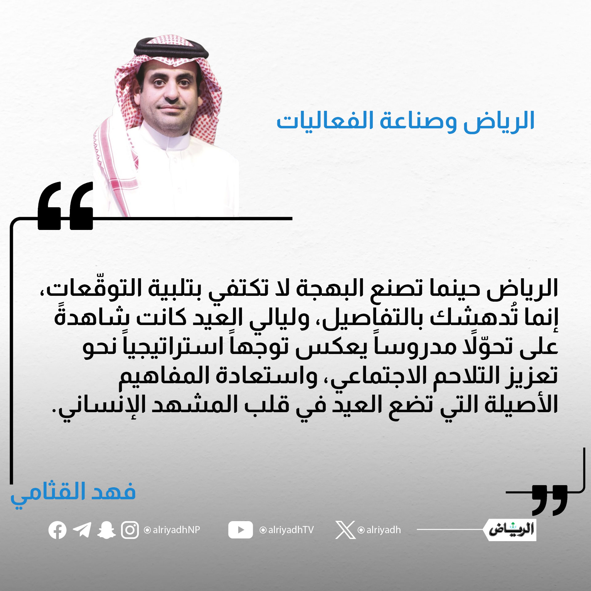 الرياض حينما تصنع البهجة لا تكتفي بتلبية التوقّعات، إنما تُدهشك بالتفاصيل، وليالي العيد كانت شاهدةً على تحوّلاً مدروساً يعكس توجهاً استراتيجياً نحو تعزيز التلاحم الاجتماعي، واستعادة المفاهيم الأصيلة التي تضع العيد في قلب المشهد الإنساني.